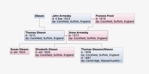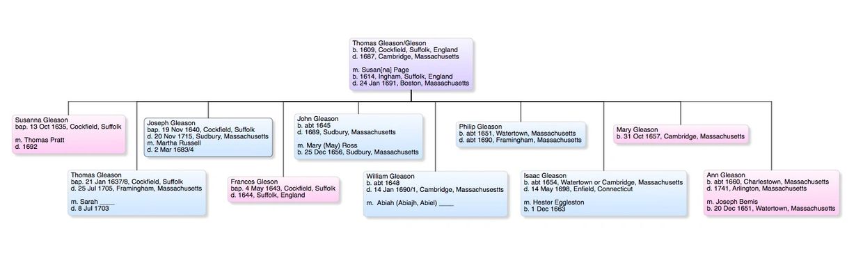 Thomas Gleason, born 1609, Cockfield, Suffolk; m. Susanna Page, born 1614, Ingham, Suffolk