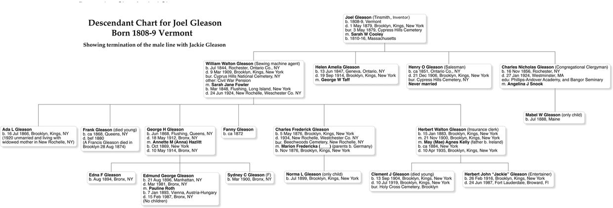 Unfortunately, there are no known living male descendants who could submit to a Y-chromosome DNA test that would prove the origin of Jackie’s male line. As long as the parentage of Joel Gleason remains a mystery, Jackie Gleason’s male line heritage will remain unknown.